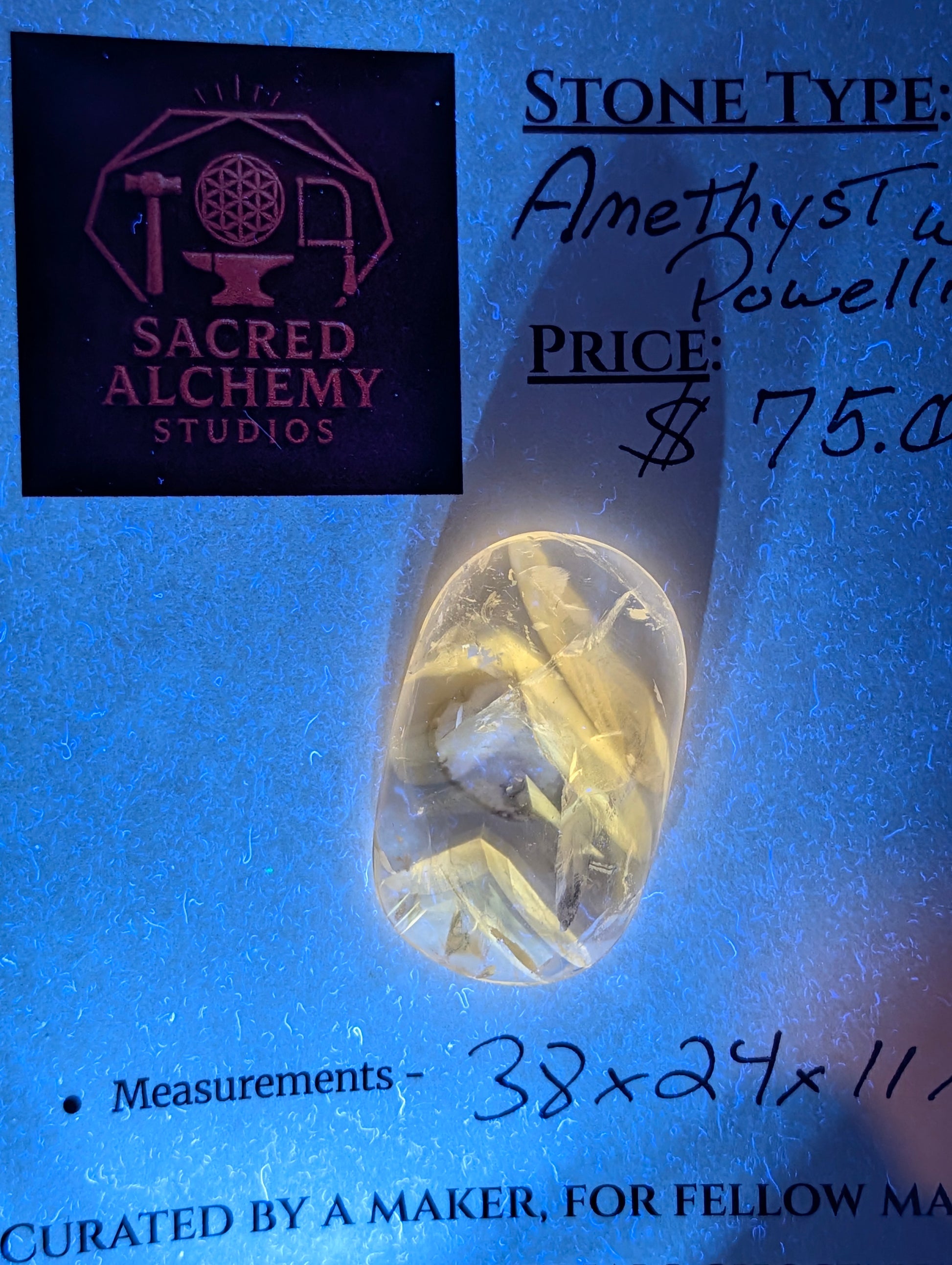 This stunning cabochon showcases a unique combination of deep purple amethyst with a rare powellite inclusion. Under UV light, the powellite inclusion glows a captivating yellow, making this piece truly one-of-a-kind. Perfect for collectors and jewelry artisans alike, it’s a conversation starter that adds a special glow to any setting.