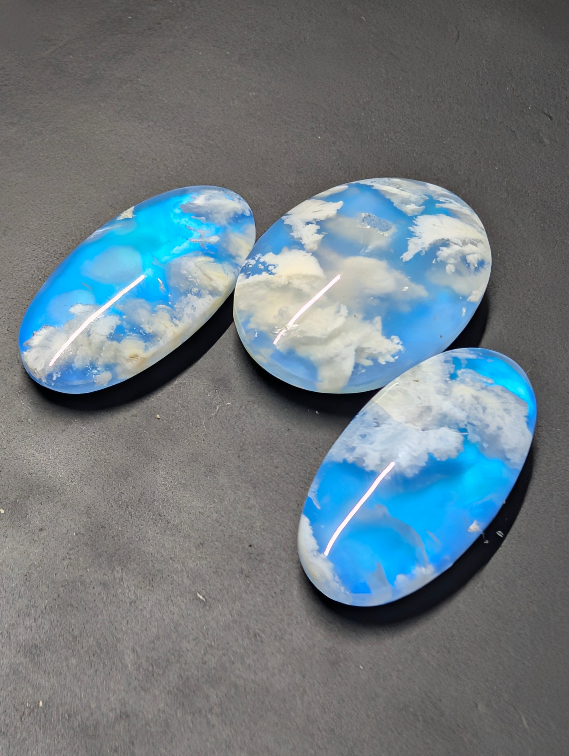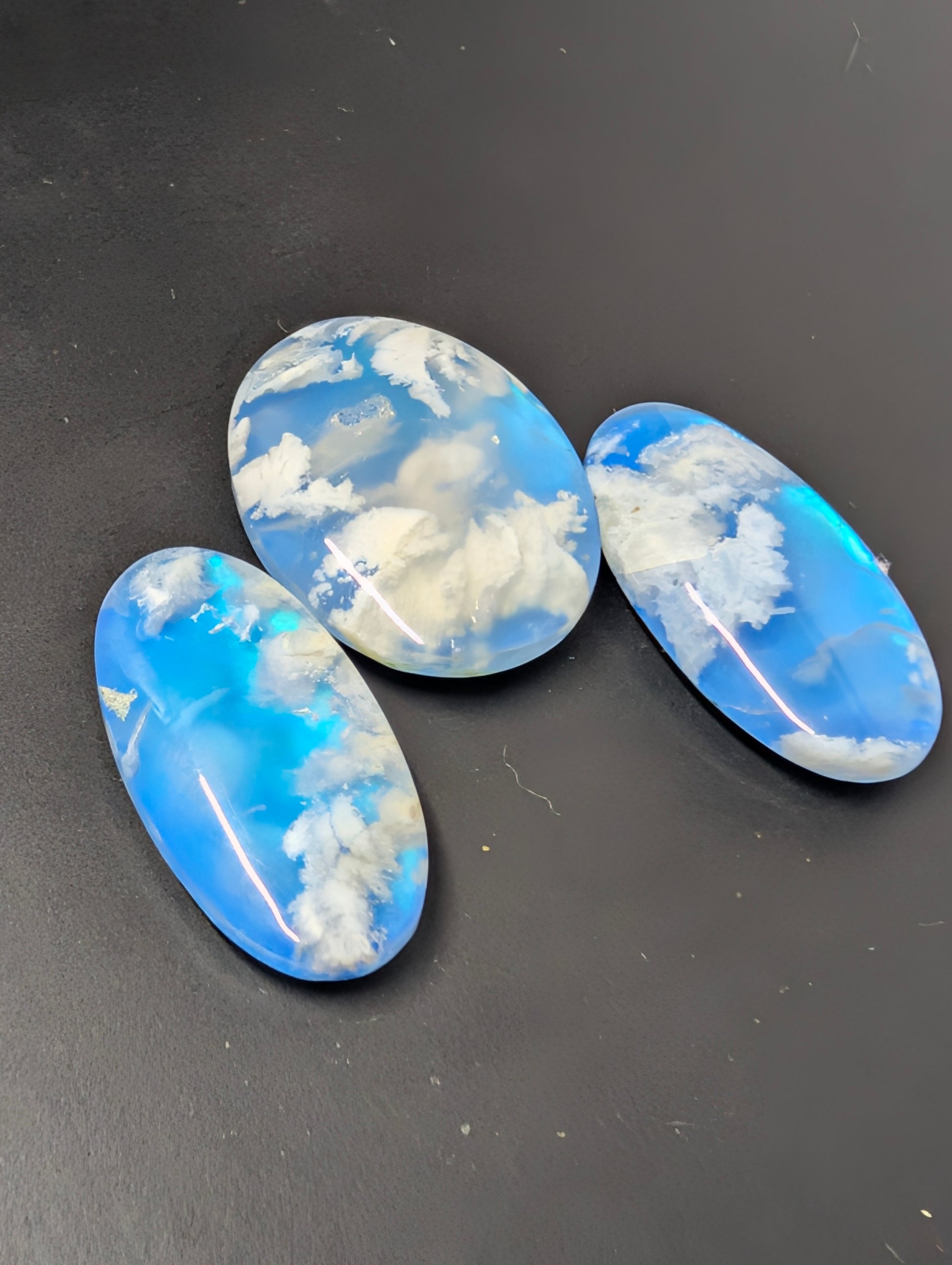This matching set features three cabochons with a striking blue plume pattern, carefully crafted as doublets to highlight their aurora-like hues. Together, they create a coordinated look ideal for pendant and earring designs, making them perfect for balanced and visually cohesive jewelry Blue Plume Aurora Doublet Cabochon Set – Indonesia – Matching Pendant & Earring Set