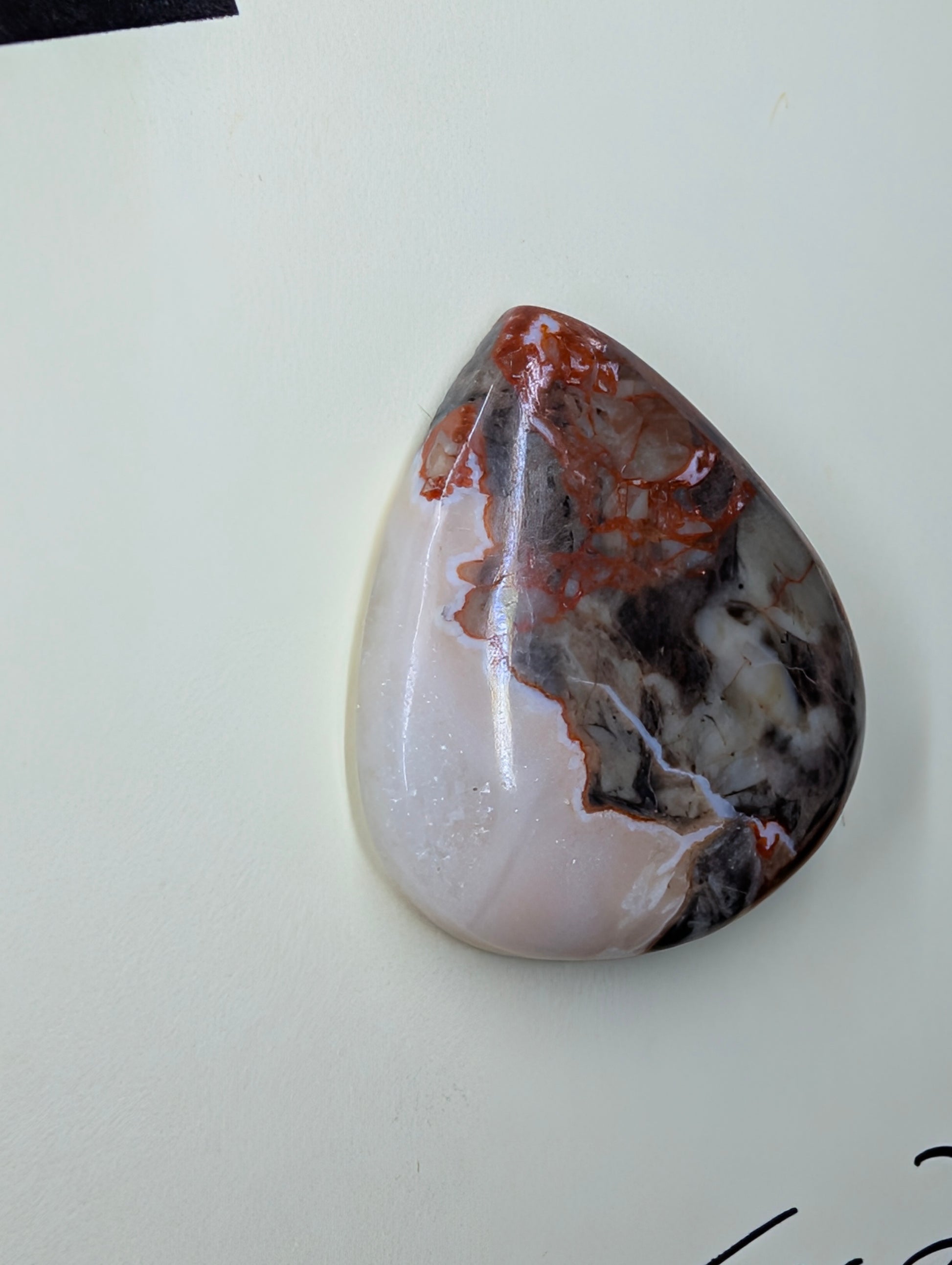 This cabochon is composed of natural Red Creek Jasper, a form of chalcedony known for its scenic color patterns.