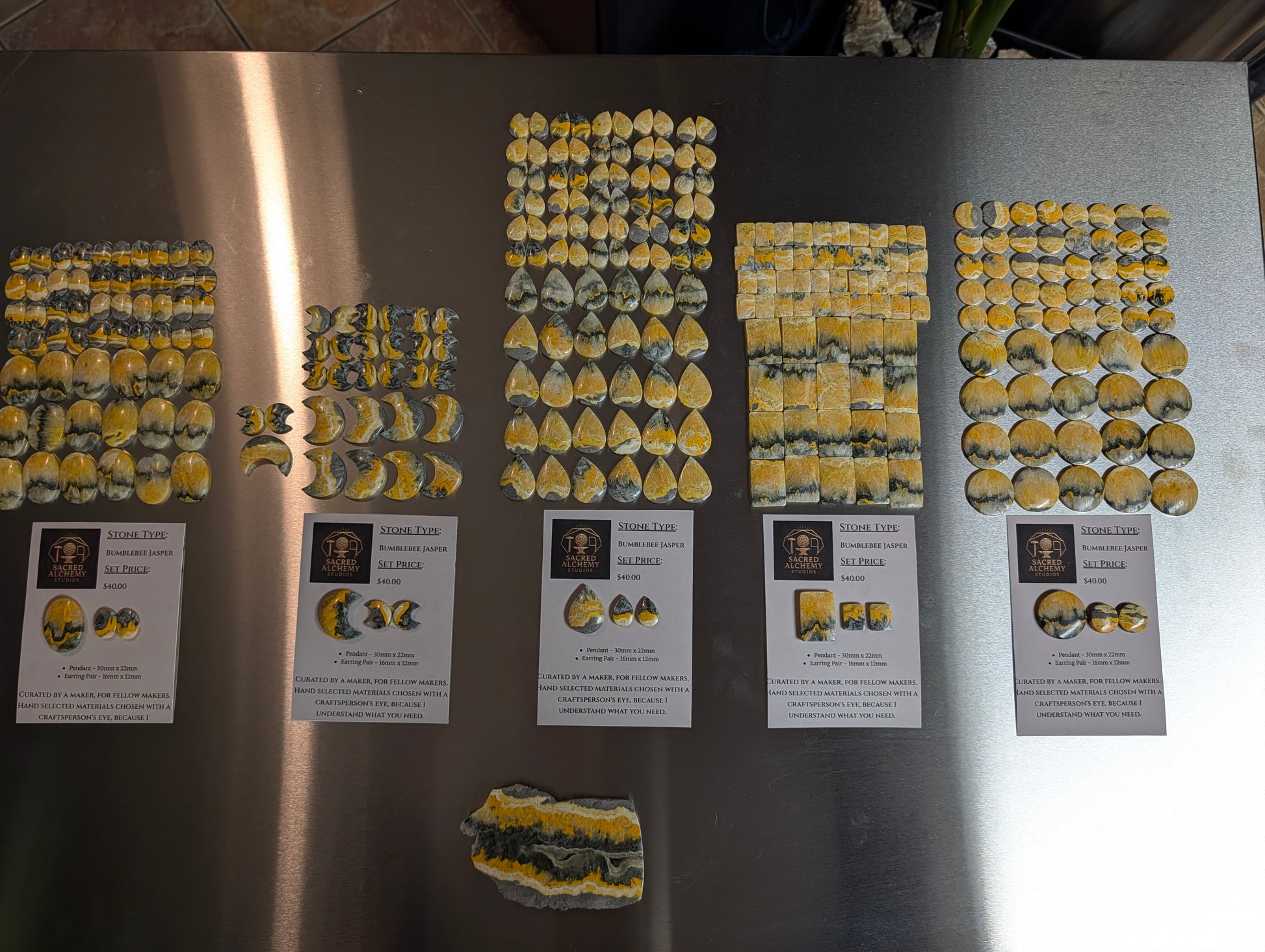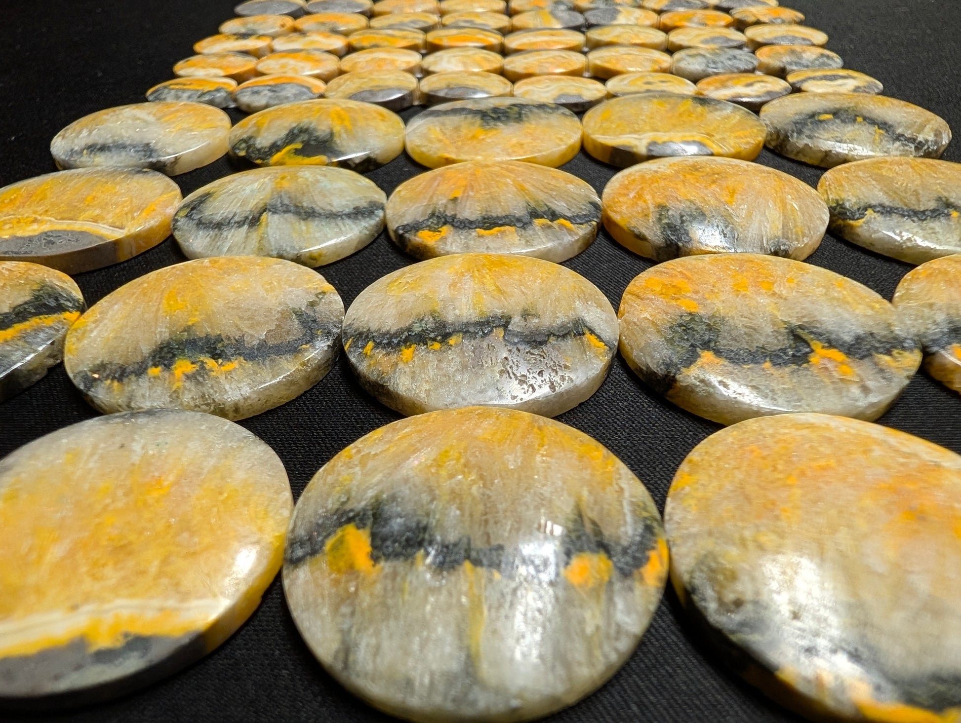 This exquisite set features high-quality Bumblebee Jasper, precision-cut into classic, elegant circle shapes. Known for its vibrant yellows, deep blacks, and volcanic origins, each stone is selected for its striking patterns and superior polish.