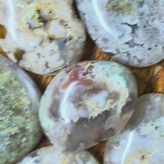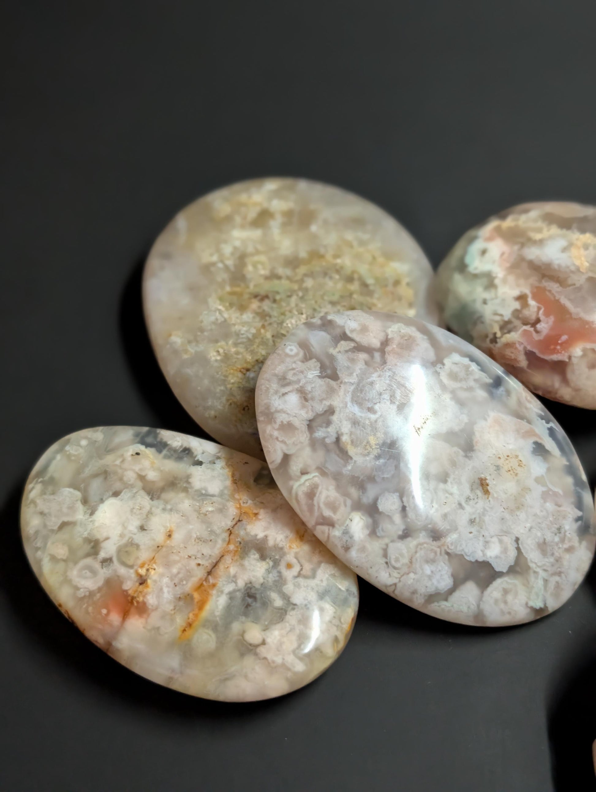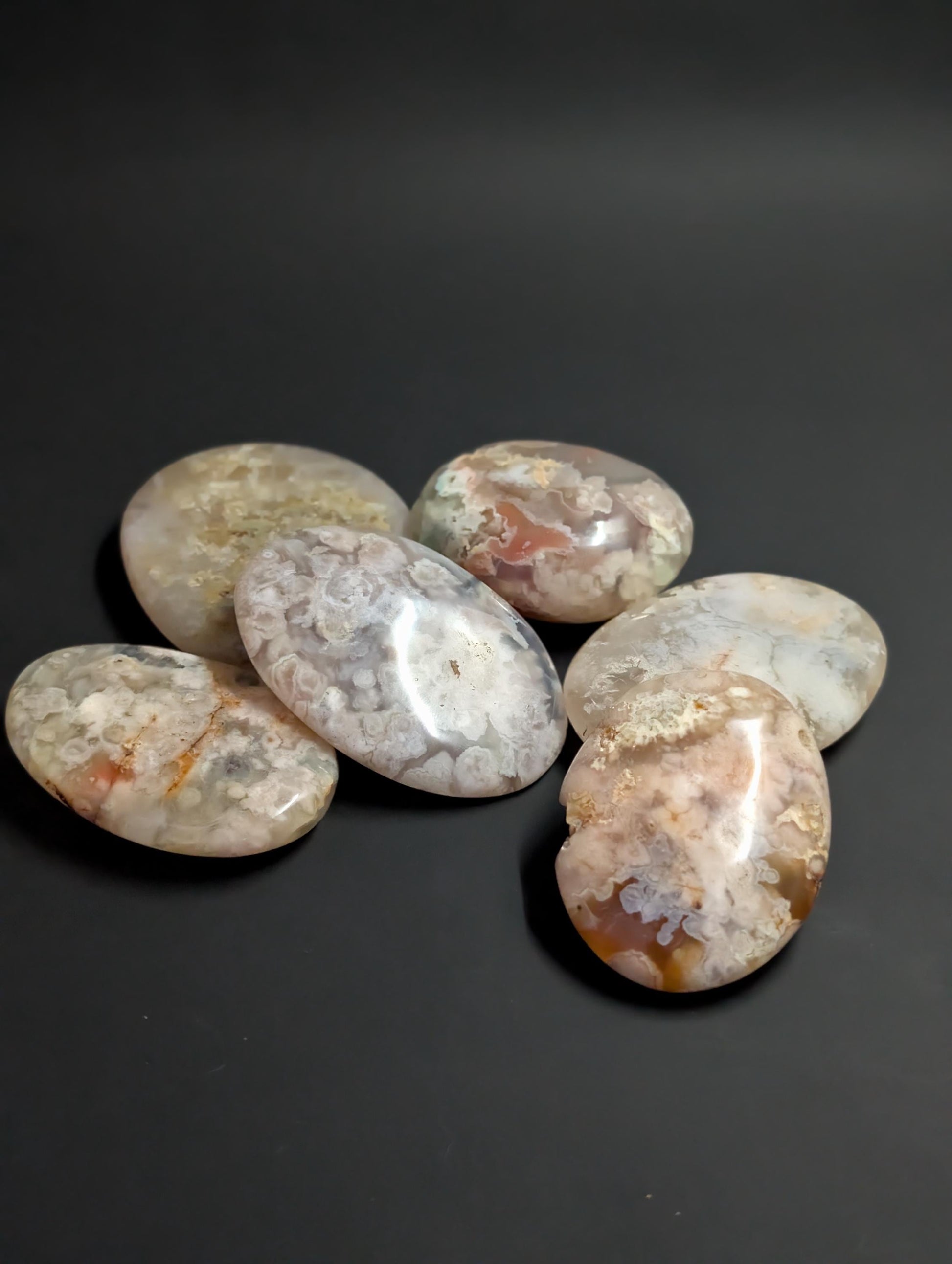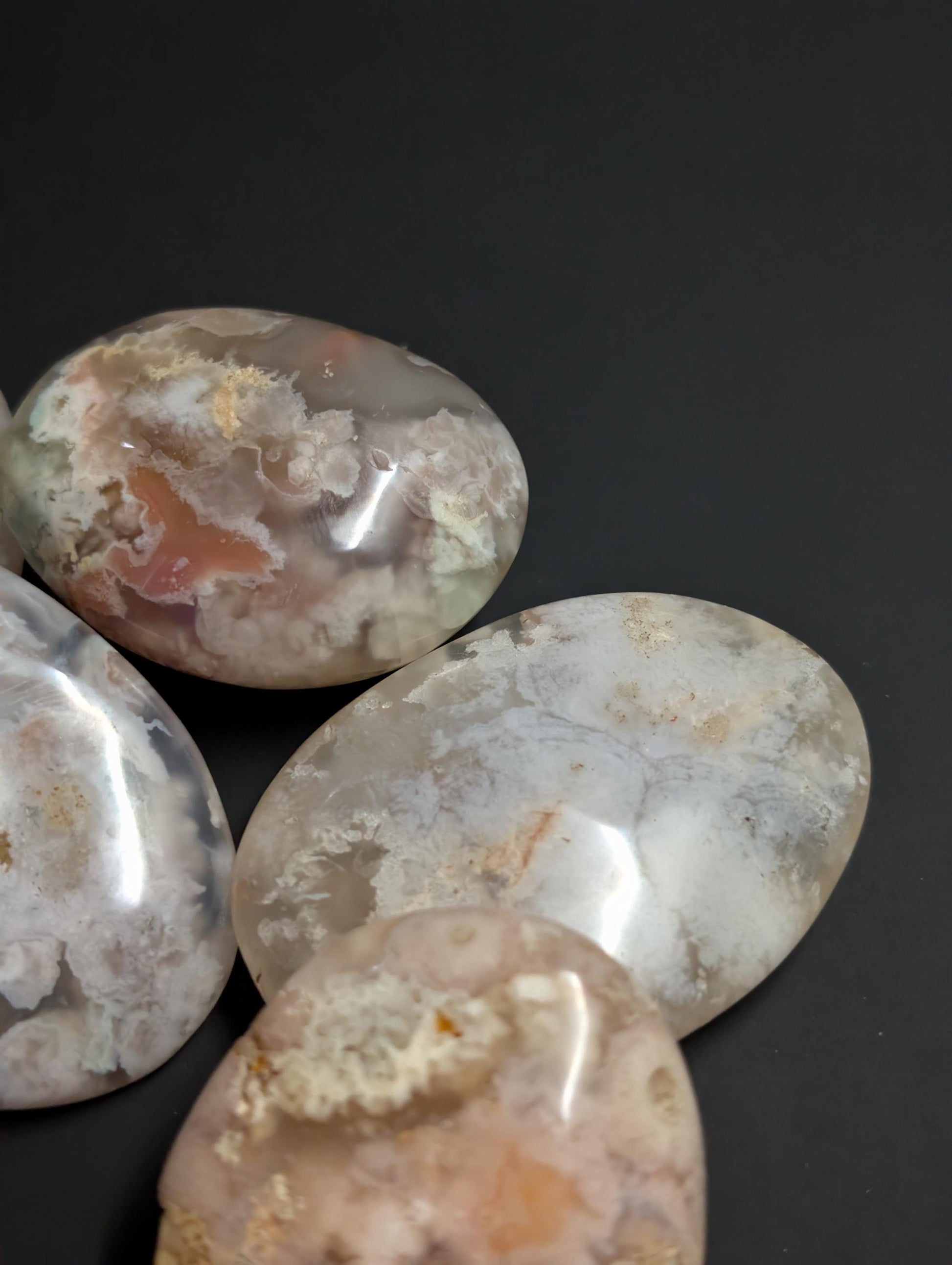 This flower agate tower from Madagascar features delicate, blossom-like inclusions that resemble tiny flowers blooming within the stone. Each piece is unique, showcasing natural patterns and a soft, nurturing energy.