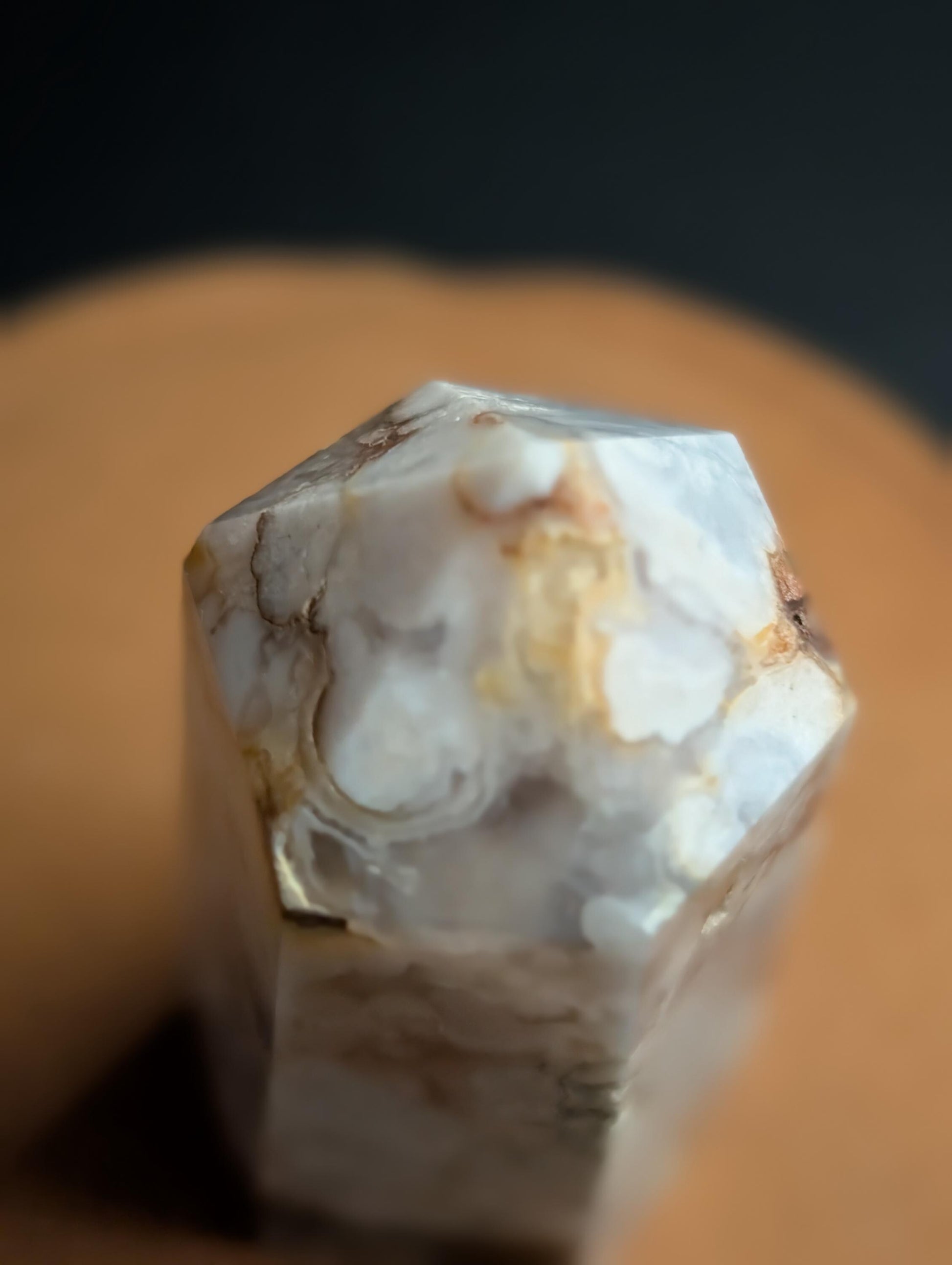 This flower agate tower from Madagascar features delicate, blossom-like inclusions that resemble tiny flowers blooming within the stone. Each piece is unique, showcasing natural patterns and a soft, nurturing energy.
