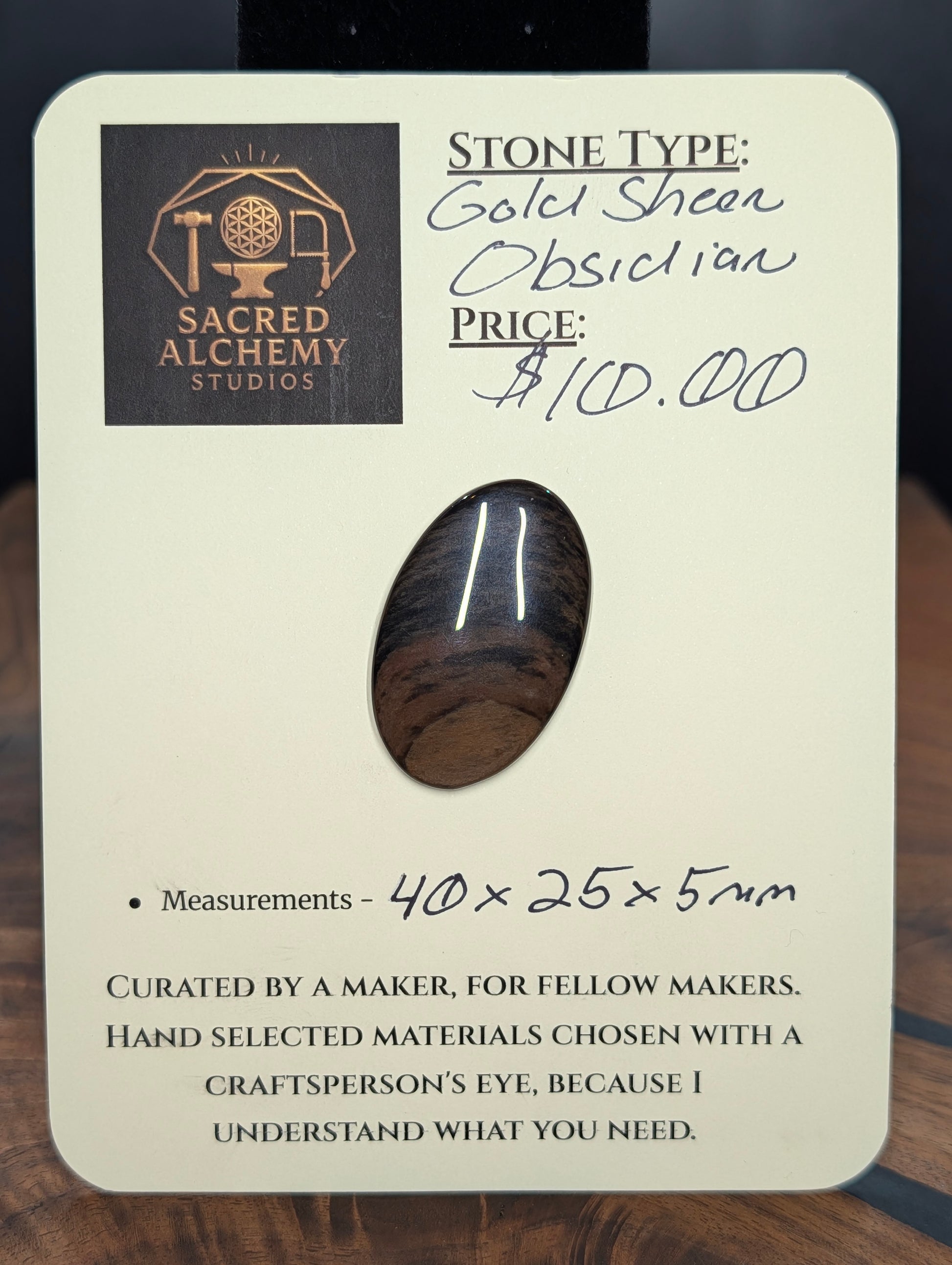 The Specimen Gold sheen obsidian cabochon with a clean black base and a strong gold flash that shows best under direct light. Smooth high polish, crisp dome, clean edges, ready for wire wrapping, bezel setting, or jewelry builds. The gold sheen comes from layered flow textures and micro-bubbles formed as the lava cooled, which creates the metallic look when light hits it. - A bold statement stone for rings and pendants - Wire-wrapping and bezel projects that need a dark base with a gold pop - Gifts for someone who likes black and gold jewelry - Photo and video content, the flash reads well in sunlight and moving light