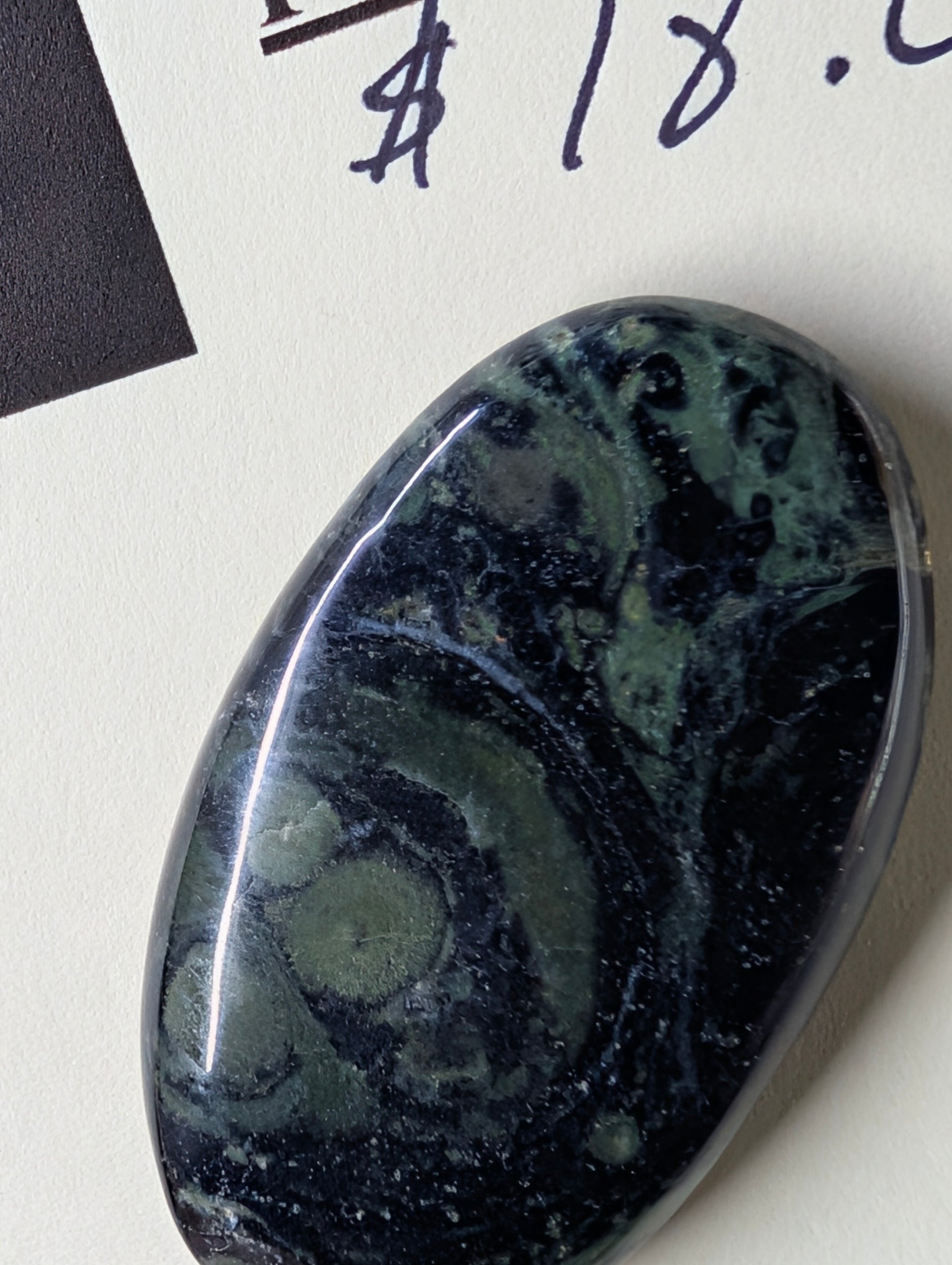 This striking Kambaba Jasper (often called Crocodile Jasper) features a mesmerizing pattern of deep forest green and swirling black orbs. The ancient, rhythmic patterns within the stone give it a prehistoric, organic aesthetic that is truly one-of-a-kind.