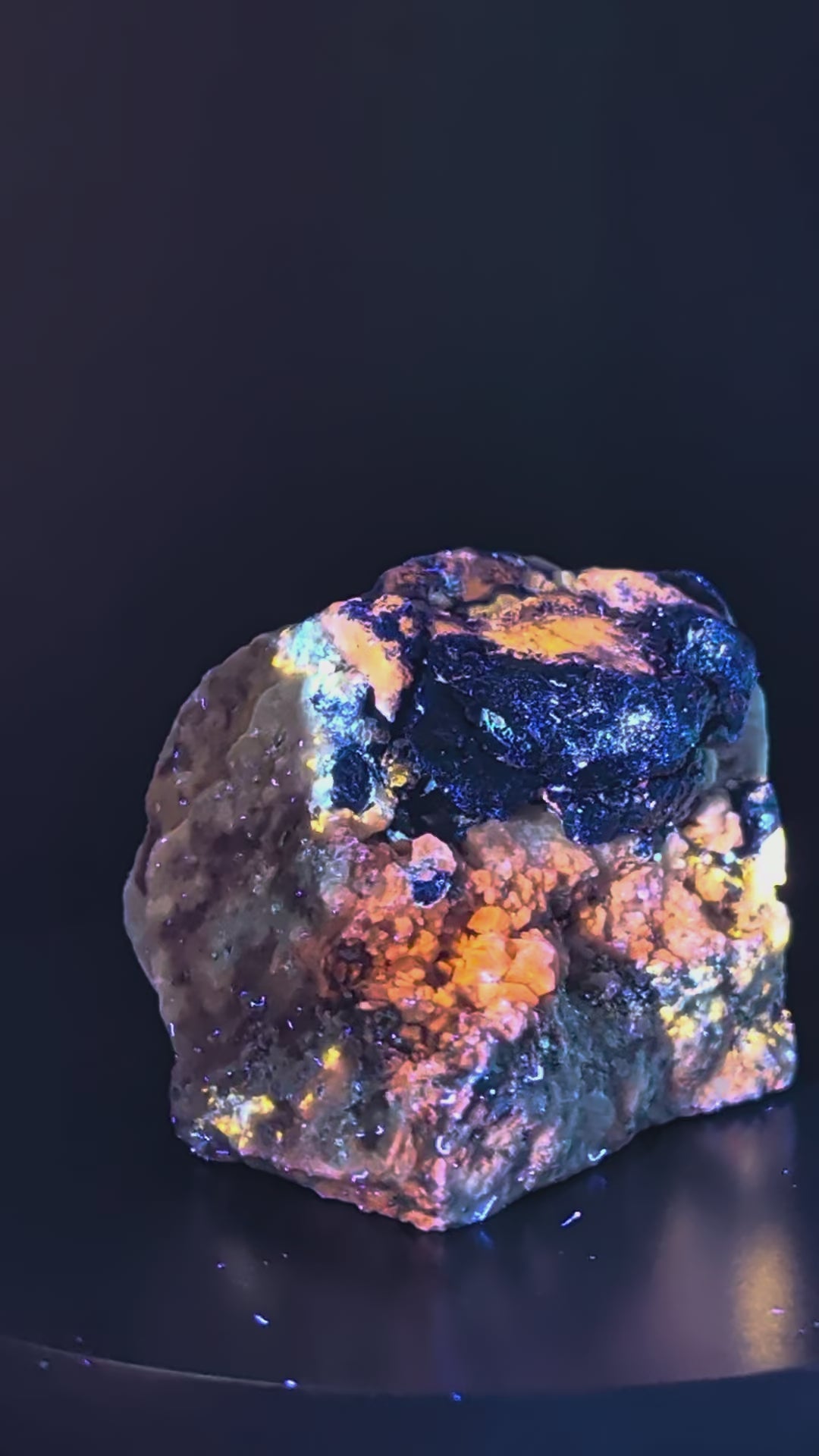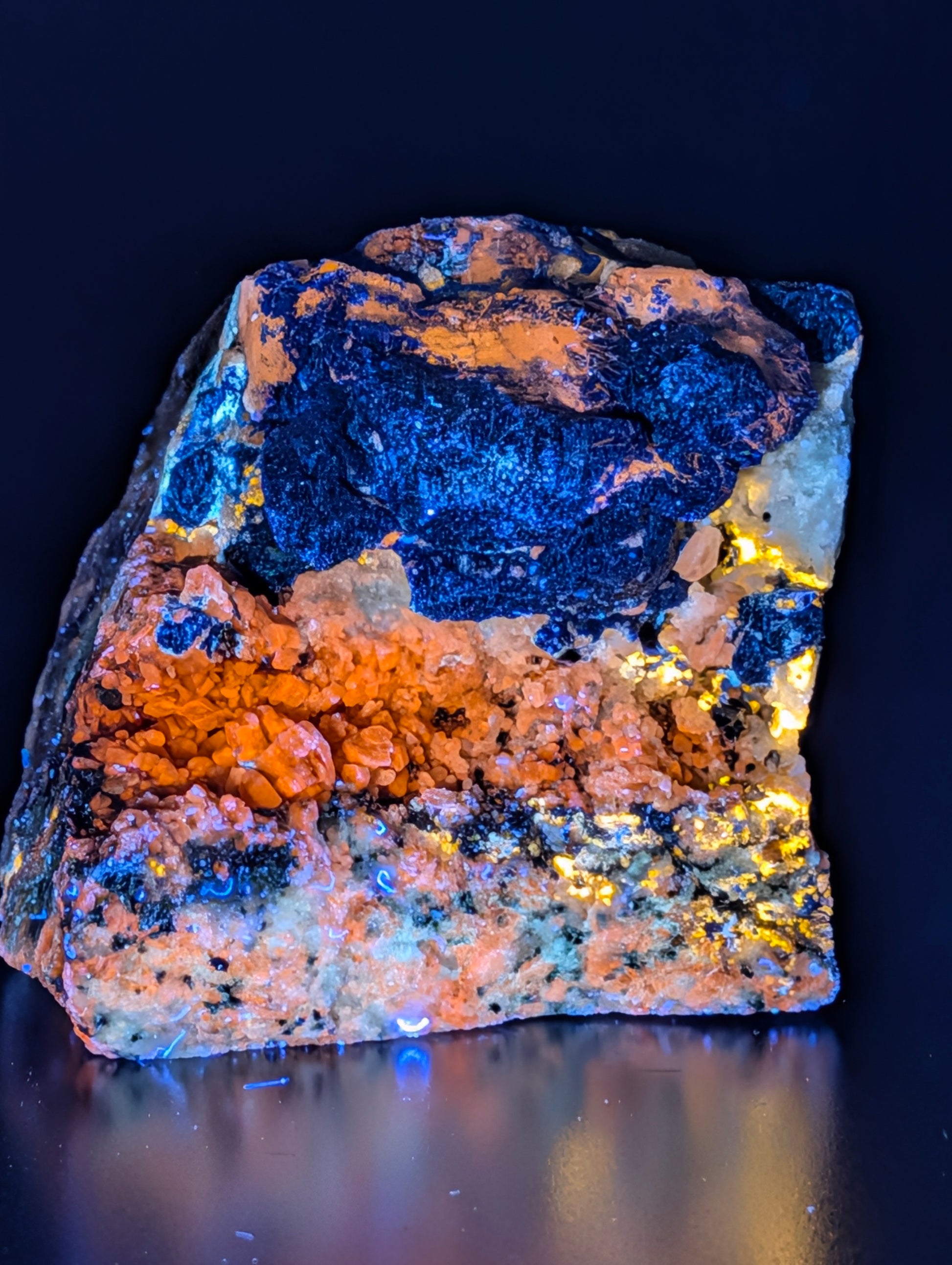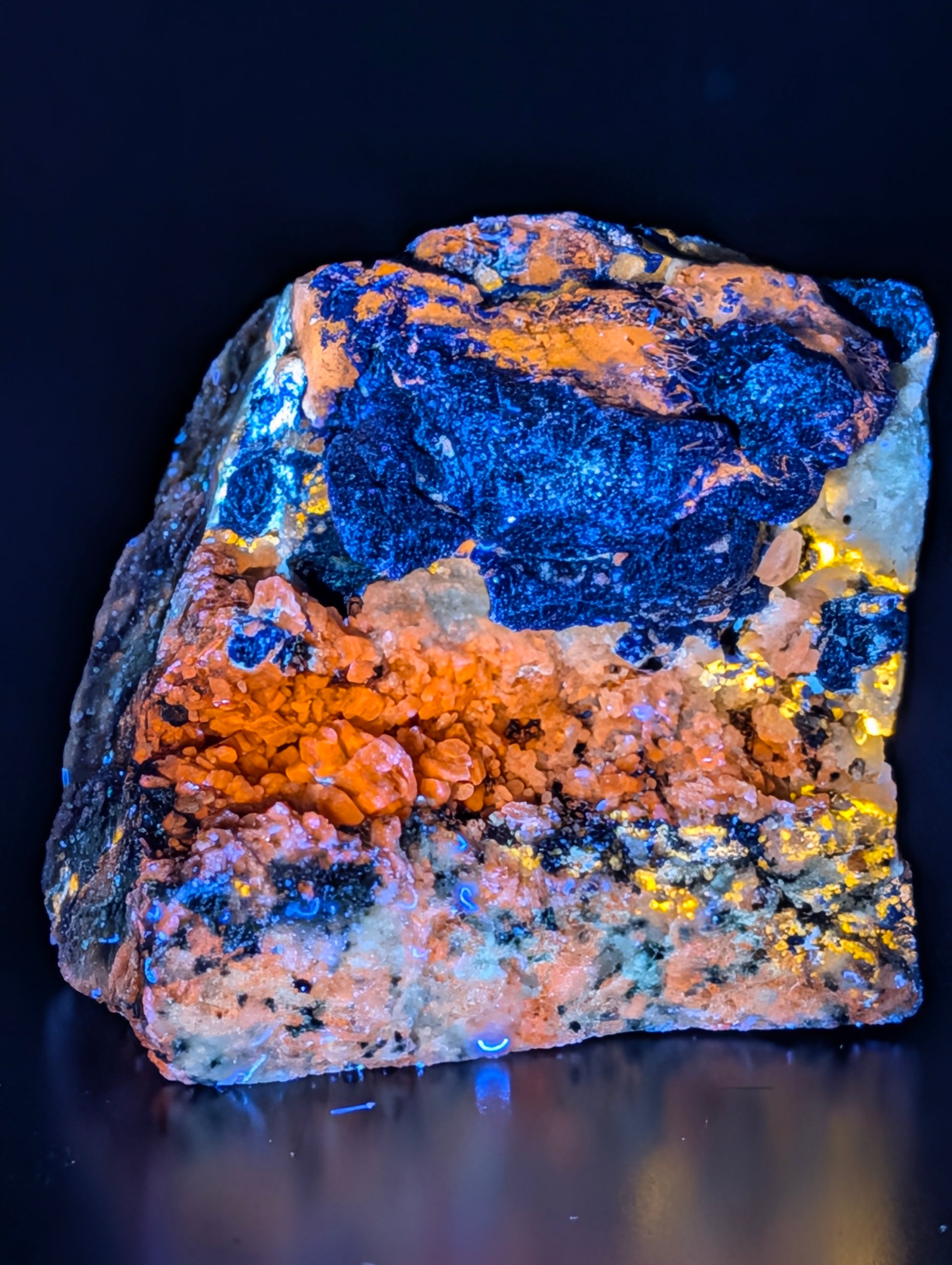 Studio Note This is a premium collector-grade specimen. While Lapis is common, the distinct, large Afghanite crystal structures and the high-saturation orange fluorescence make this a "Museum Quality" piece for those who specialize in reactive minerals.