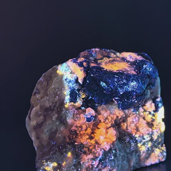This specific piece is defined by its "amazing UV" reactivity. Under a 365nm long-wave UV light, the Afghanite crystals ignite with an intense, glowing orange luminescence that contrasts beautifully against the dark Lazurite and the metallic shimmer of the Pyrite. The "banding" of the minerals is exceptional, creating a natural landscape effect where the Lazurite forms a dark "sky" over the glowing Afghanite structures.