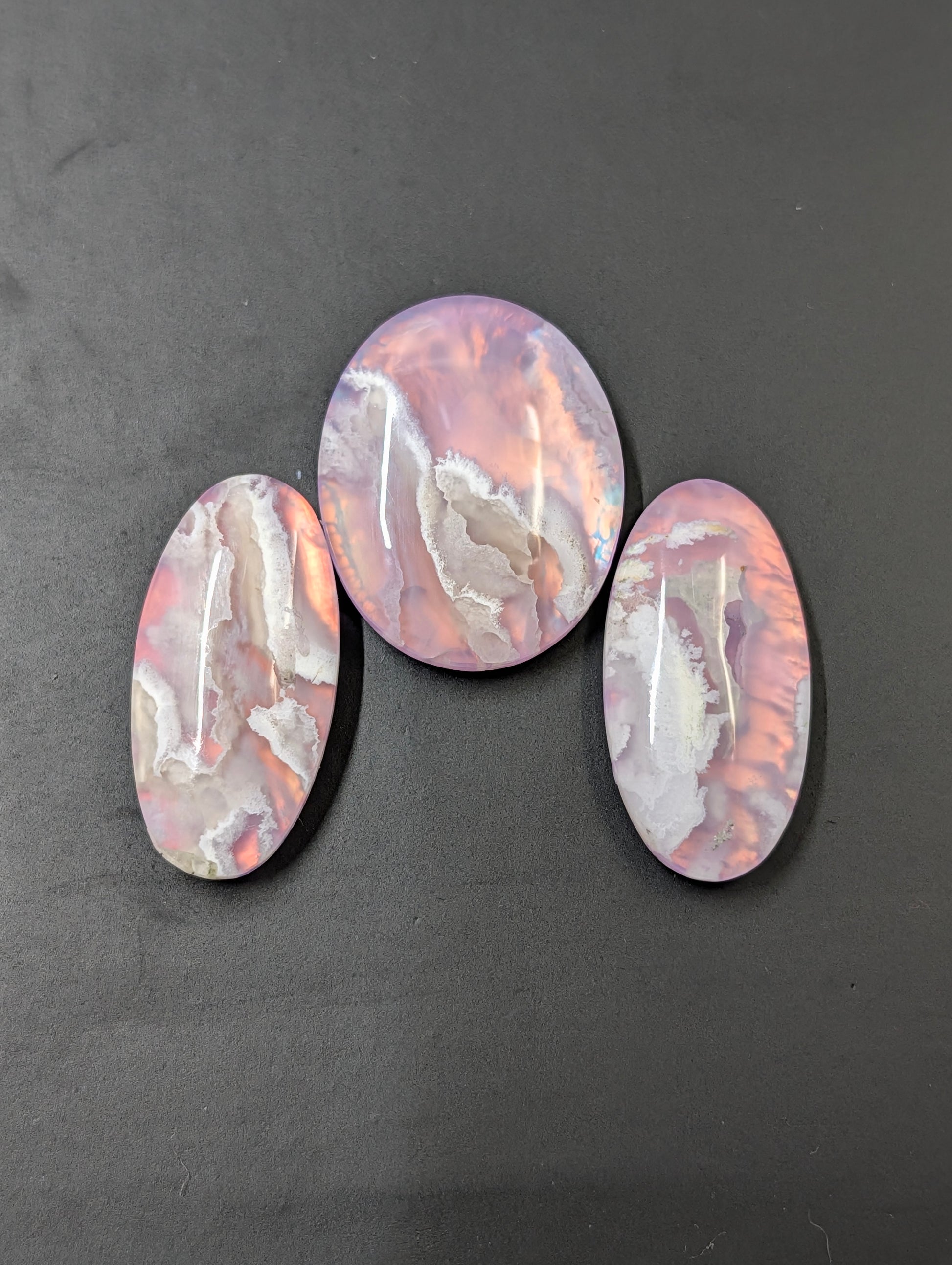 This matching set features three cabochons with a striking pink plume pattern, carefully crafted as doublets to highlight their aurora-like hues. Together, they create a coordinated look ideal for pendant and earring designs, making them perfect for balanced and visually cohesive jewelry projects.