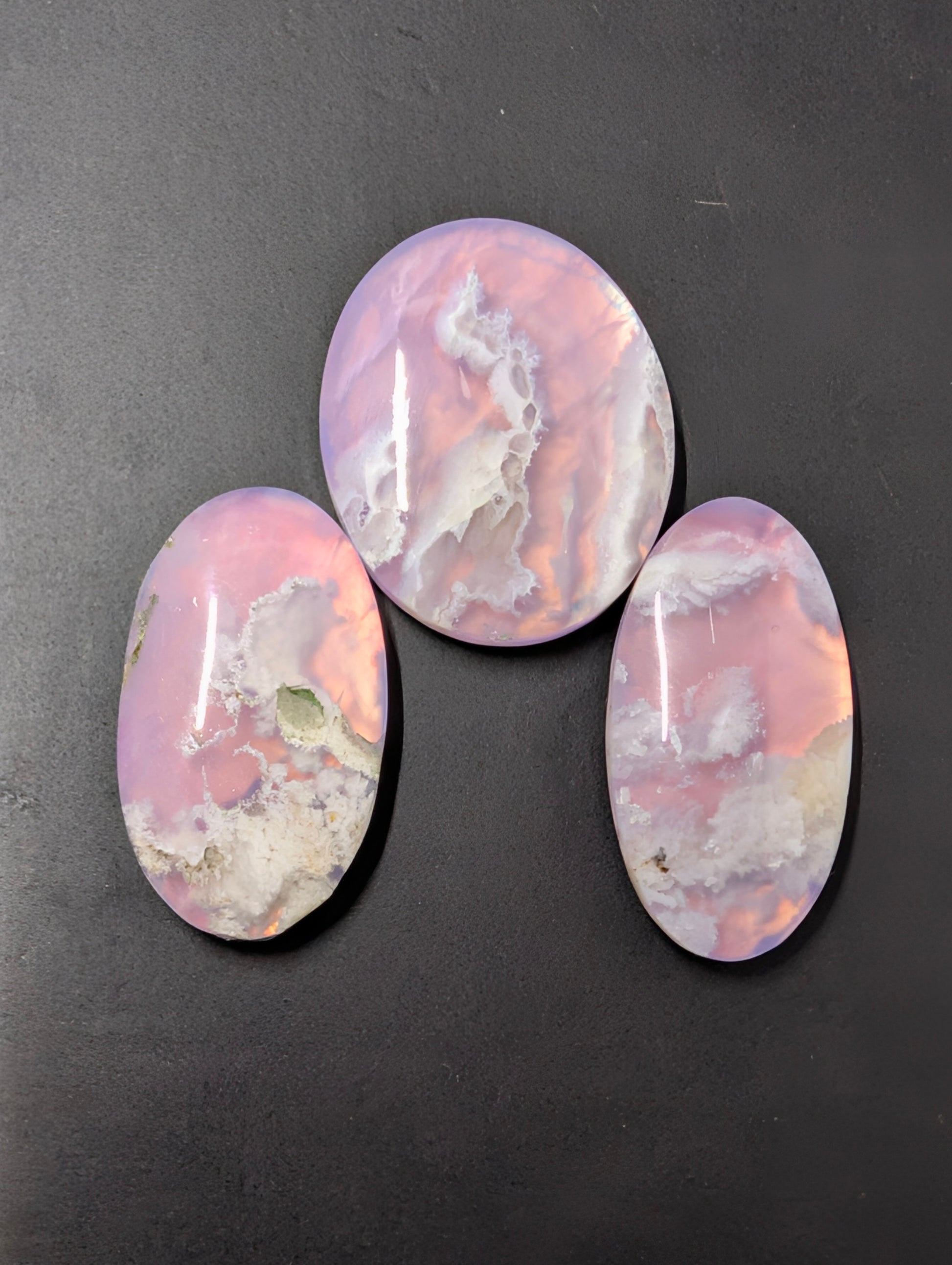 This matching set features three cabochons with a striking pink plume pattern, carefully crafted as doublets to highlight their aurora-like hues. Together, they create a coordinated look ideal for pendant and earring designs, making them perfect for balanced and visually cohesive jewelry projects.