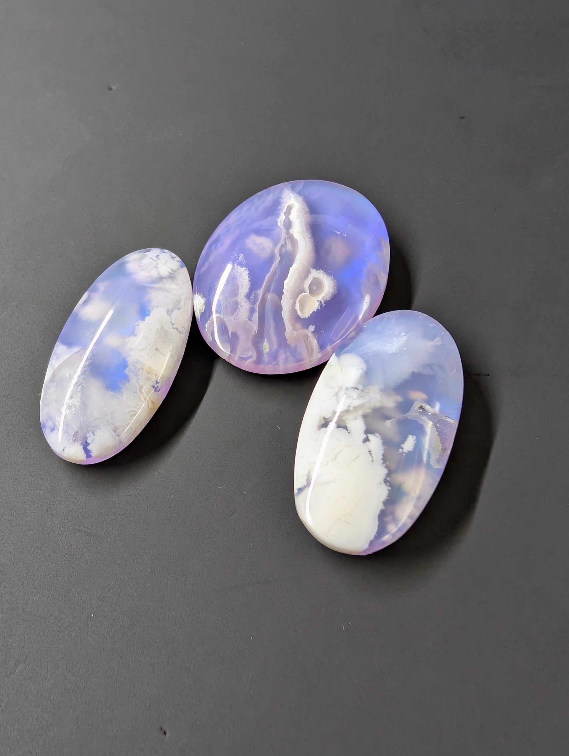 This matching set features three cabochons with a striking purple plume pattern, carefully crafted as doublets to highlight their aurora-like hues. Together, they create a coordinated look ideal for pendant and earring designs, making them perfect for balanced and visually cohesive jewelry projects.