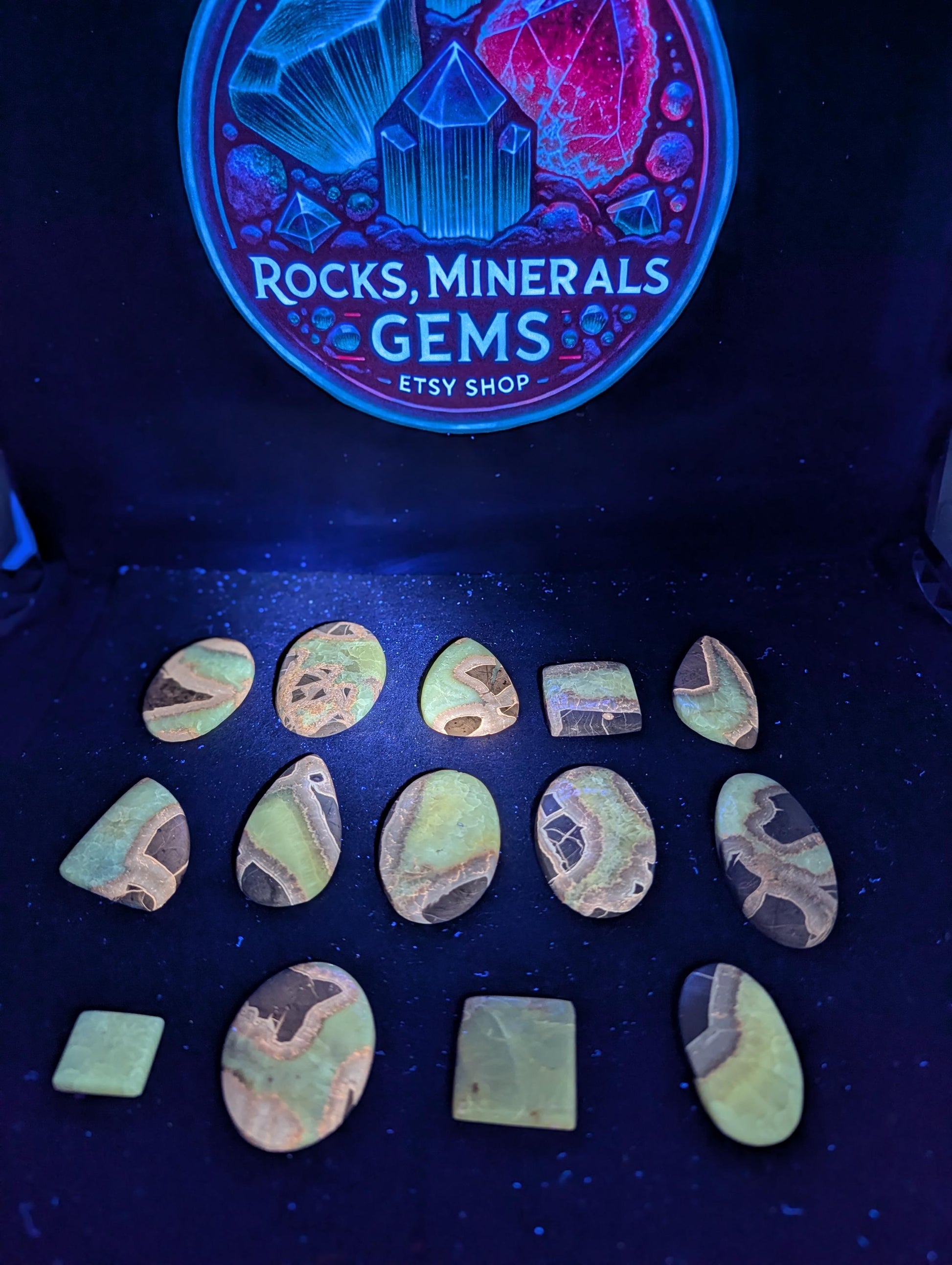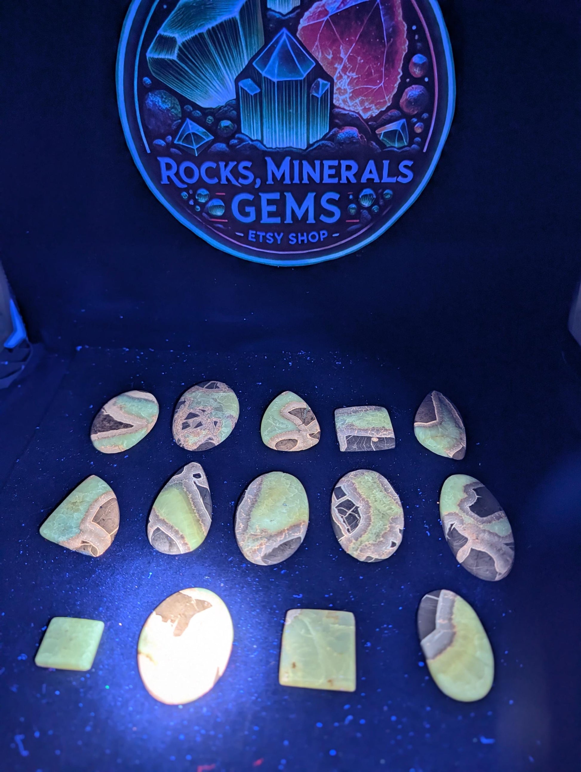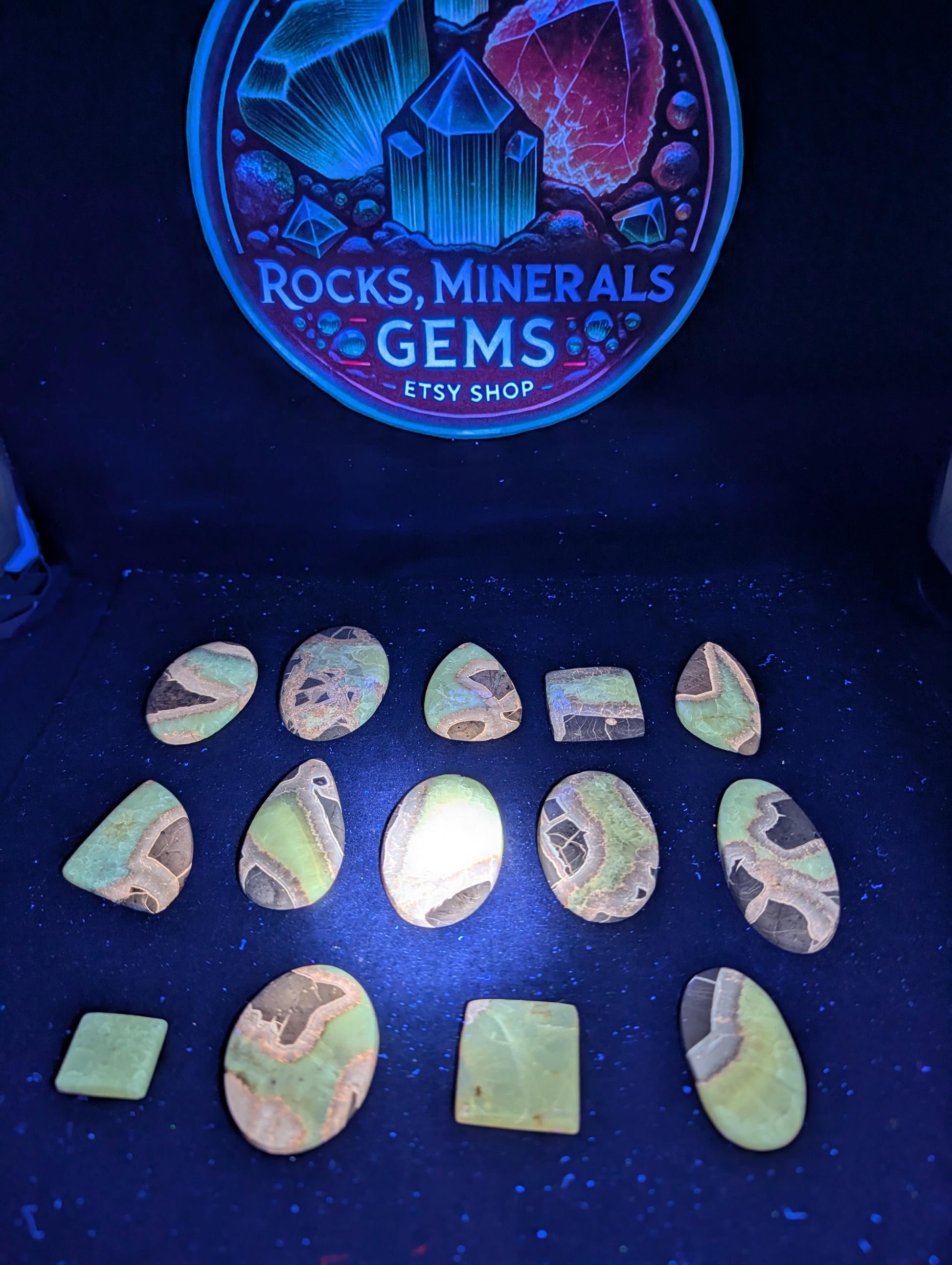 This septarian cabochon comes from Utah and shows the classic mix of yellow calcite, brown aragonite, and gray matrix. The polished surface highlights the natural cracks and striking patterns that make septarian a favorite for collectors. This piece is also UV reactive, and the calcite areas phosphoresce after the light source is removed, giving it an extra visual effect for UV mineral enthusiasts.