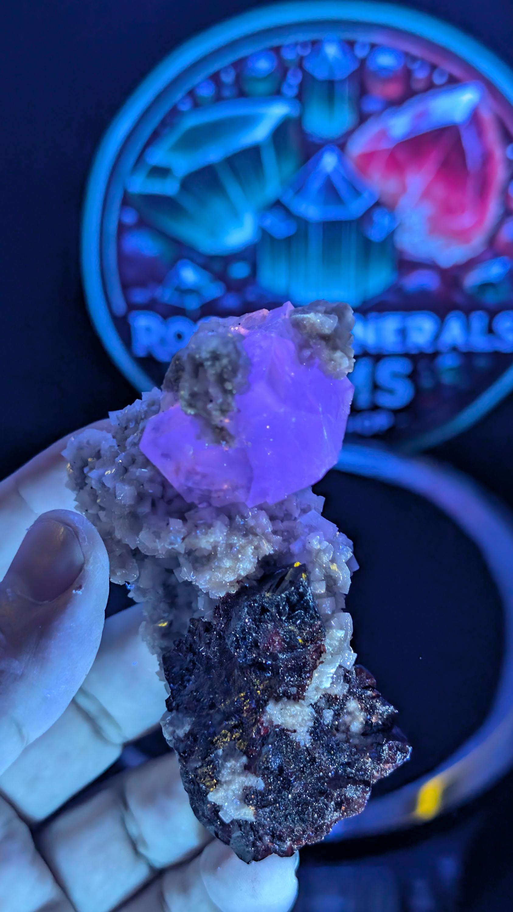 The fluorite shows the classic Tennessee purple. The dolomite sits as tight saddle-shaped crystals across the base. The sphalerite shows bright, glossy faces that catch the light cleanly.