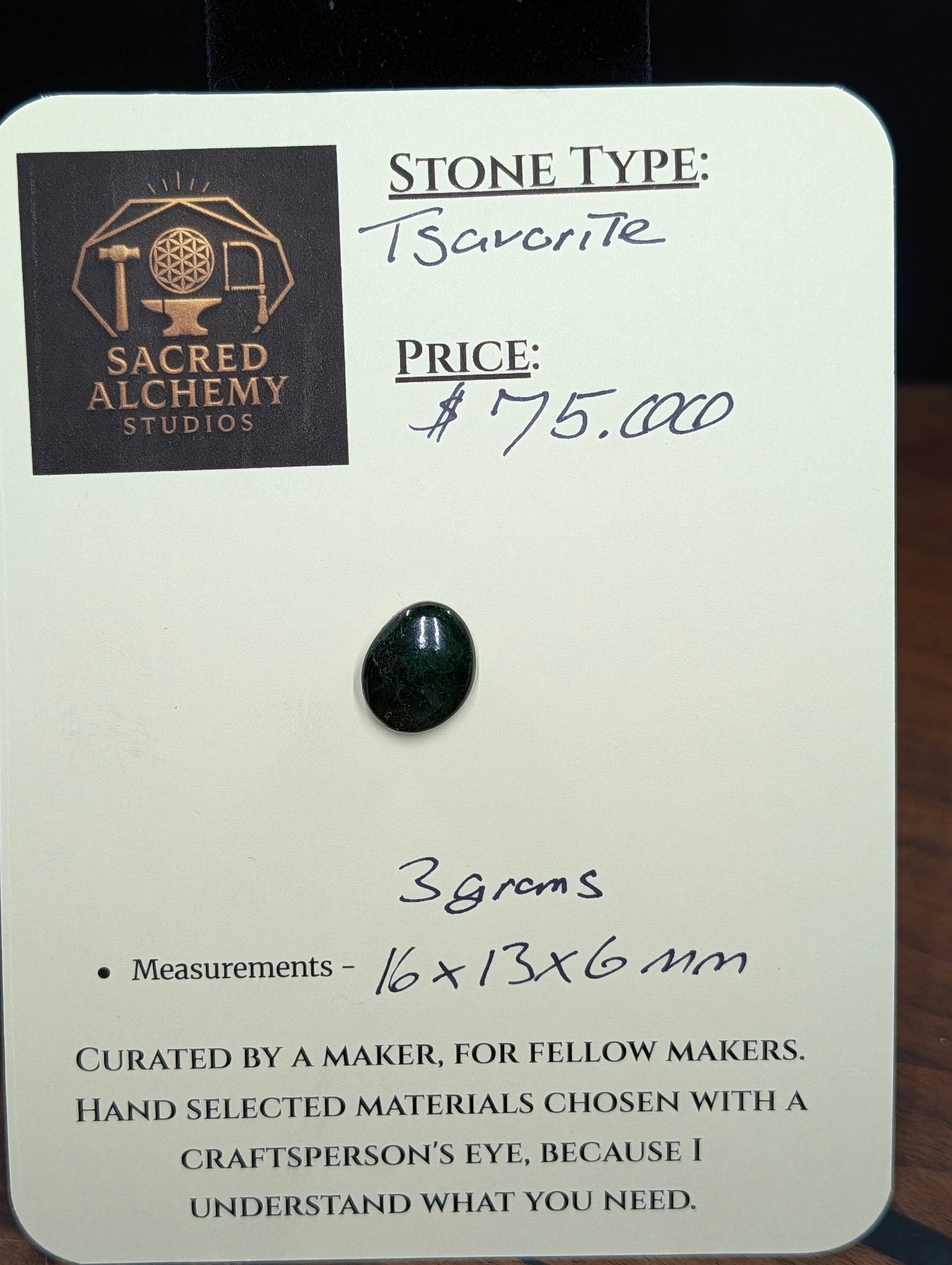Studio Note Finding a Tsavorite in a 3-gram cabochon is a rarity. Most Tsavorite is found in very small crystals, so a specimen of this size and saturation is a true collector's piece and a significant investment for any jeweler or collector.