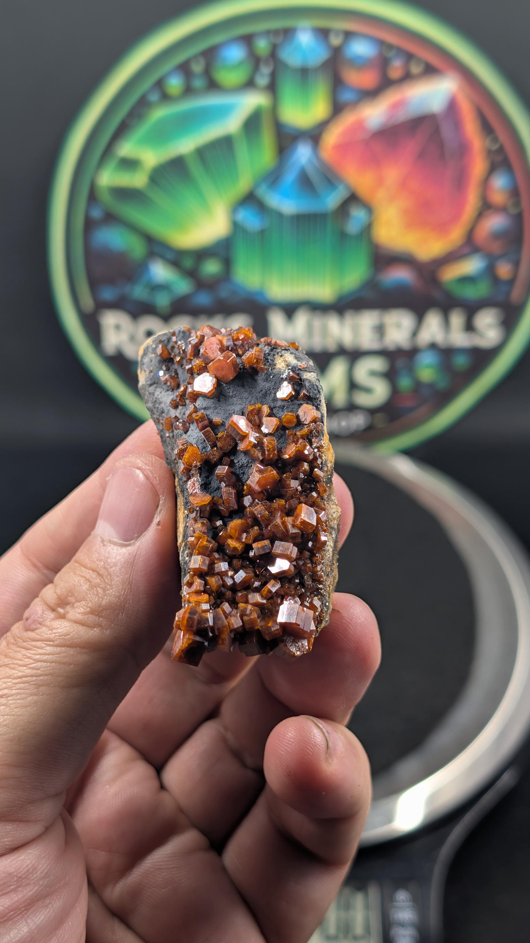 This is a vanadinite specimen from Morocco’s Atlas Mountains, sourced from the well-known Mibladen mining district. The crystals show strong cherry-red to orange color that reads clean and bright in hand. You get the classic vanadinite look here, sharp hexagonal crystals with that bold, geometric habit collectors chase. The piece sits on a desirable matrix, giving it contrast and a more complete “natural display” look instead of loose crystals.