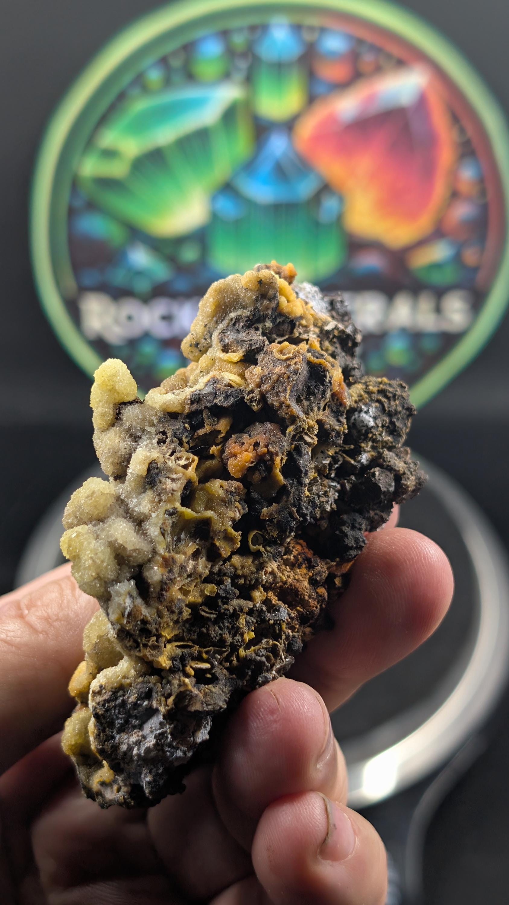 This is a natural zincite specimen from Palmerton, Carbon County, Pennsylvania. It shows the classic botryoidal and crusted formation seen in the old remediation zones of the area. Under UV light, the surface lights up with a strong yellow-green glow, with bright coverage across the face.